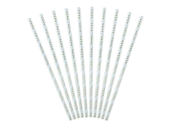 Paper straws in light blue colour with metallic gold slanted stripes, length approx. 19.5 cm. The goods cannot be sold on the German and Swiss market due to the internal legal regulations of Germany and Switzerland. Goods comply with European Union regulations. (1 pkt / 10 pc.)